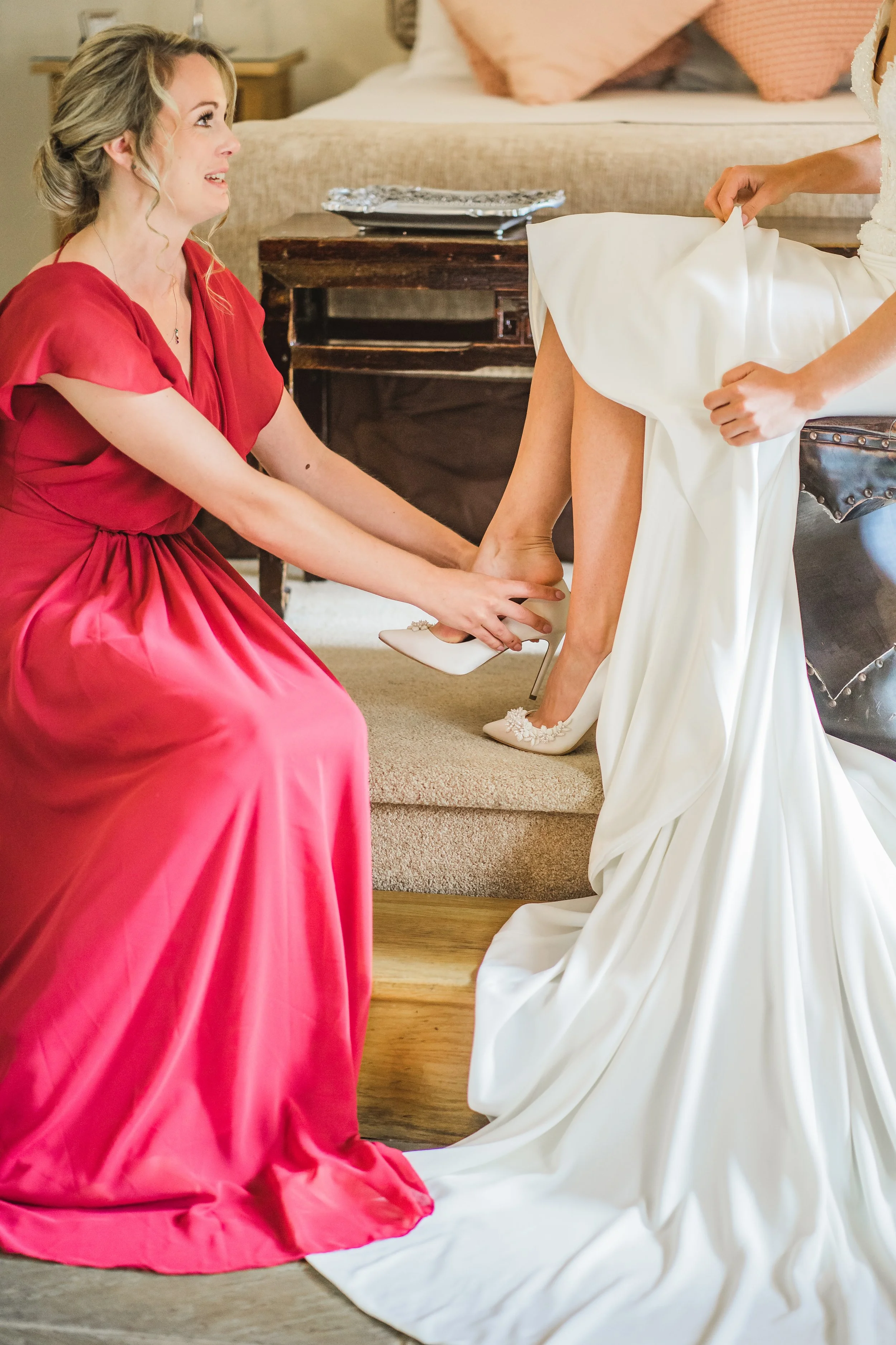 A woman in a red dress helping a bride put on her white high-heeled shoe.