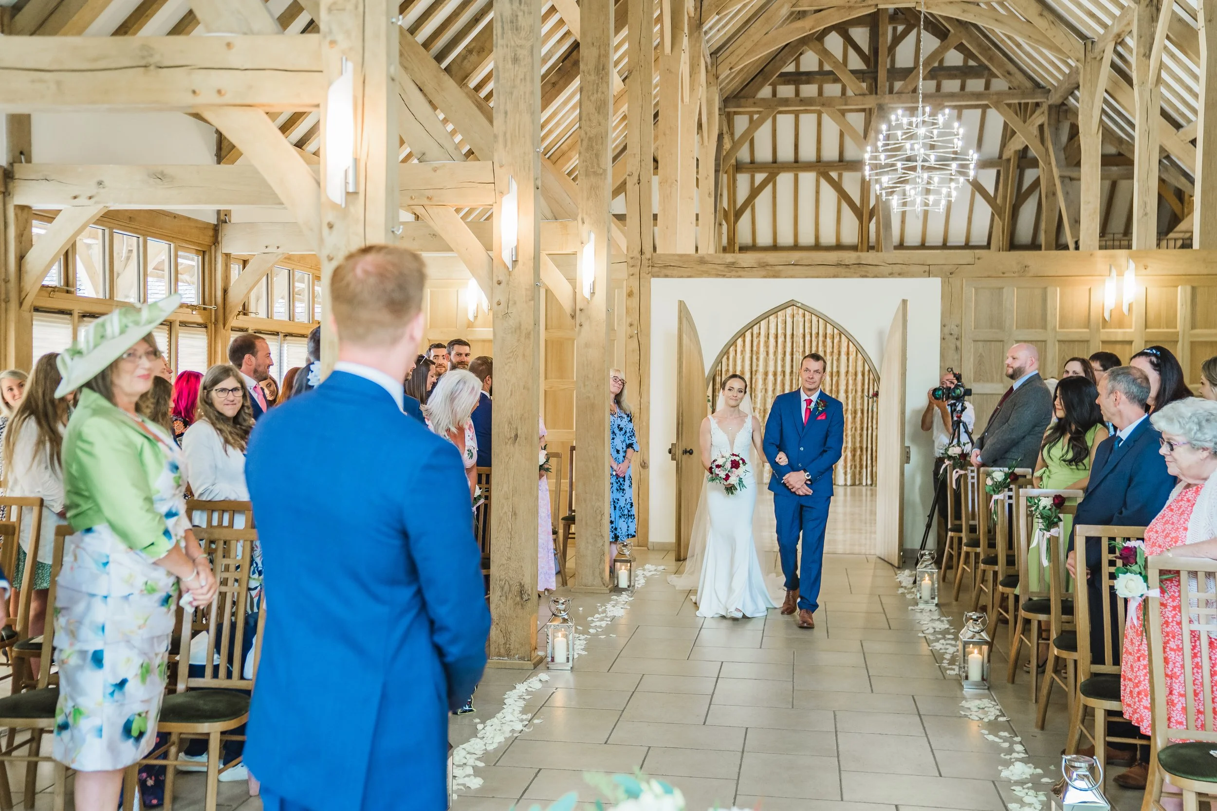 Bride in a white wedding dress walking down the aisle with her father in a blue suit in a rustic wooden wedding venue, with guests seated on either side.