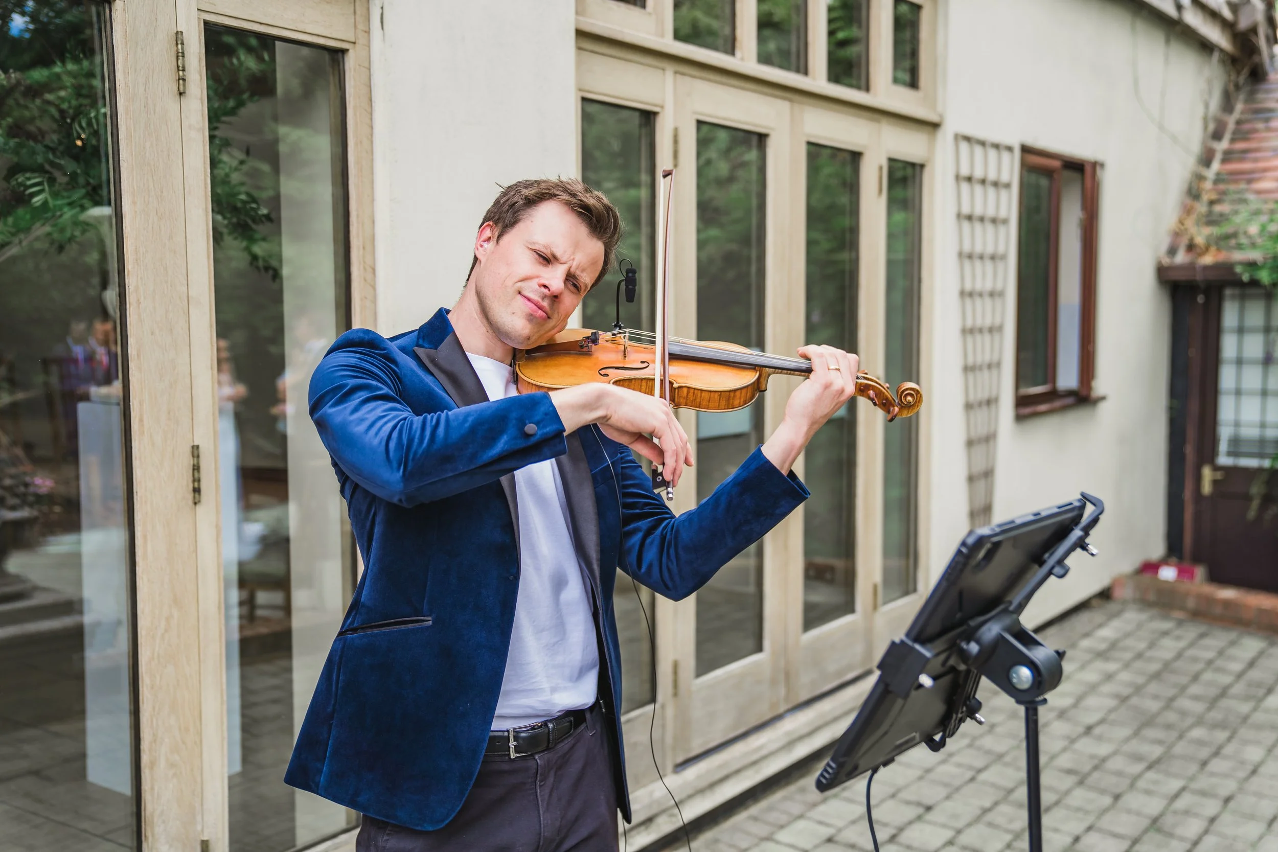 A man in a blue velvet blazer plays the violin outdoors, standing in front of a house with large windows and a music stand with a tablet or sheet music.