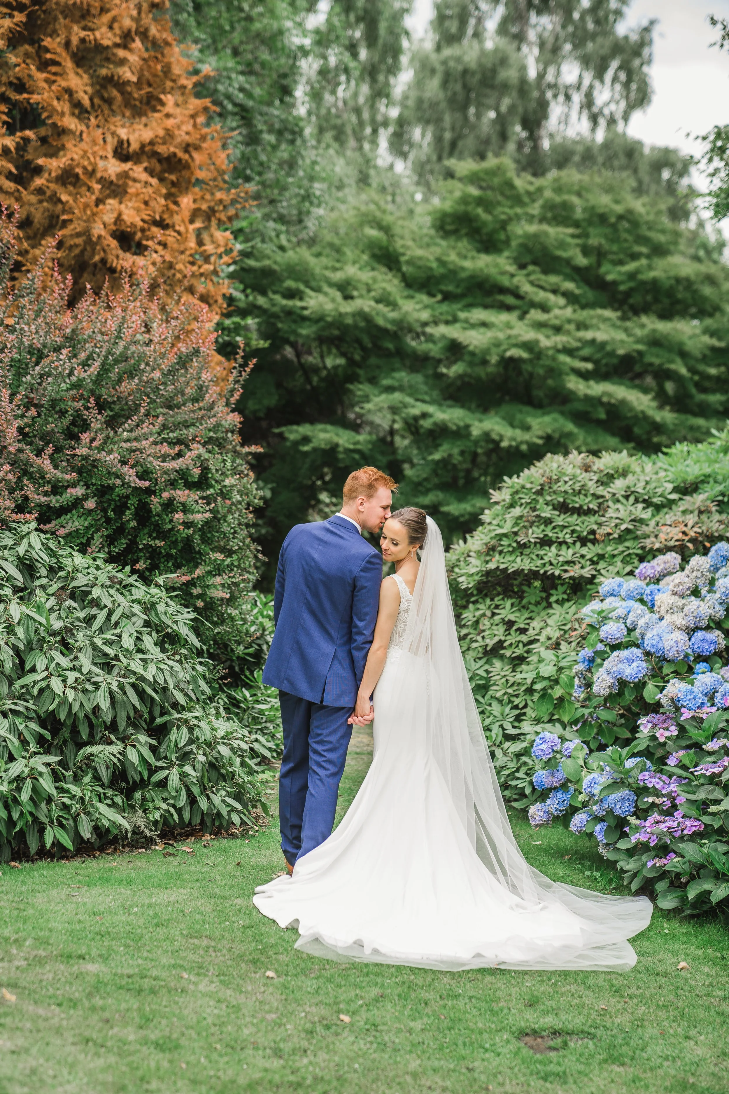 A bride and groom on their wedding day, embracing outdoors with the groom kissing the bride on the forehead, sunlight and greenery in the background.